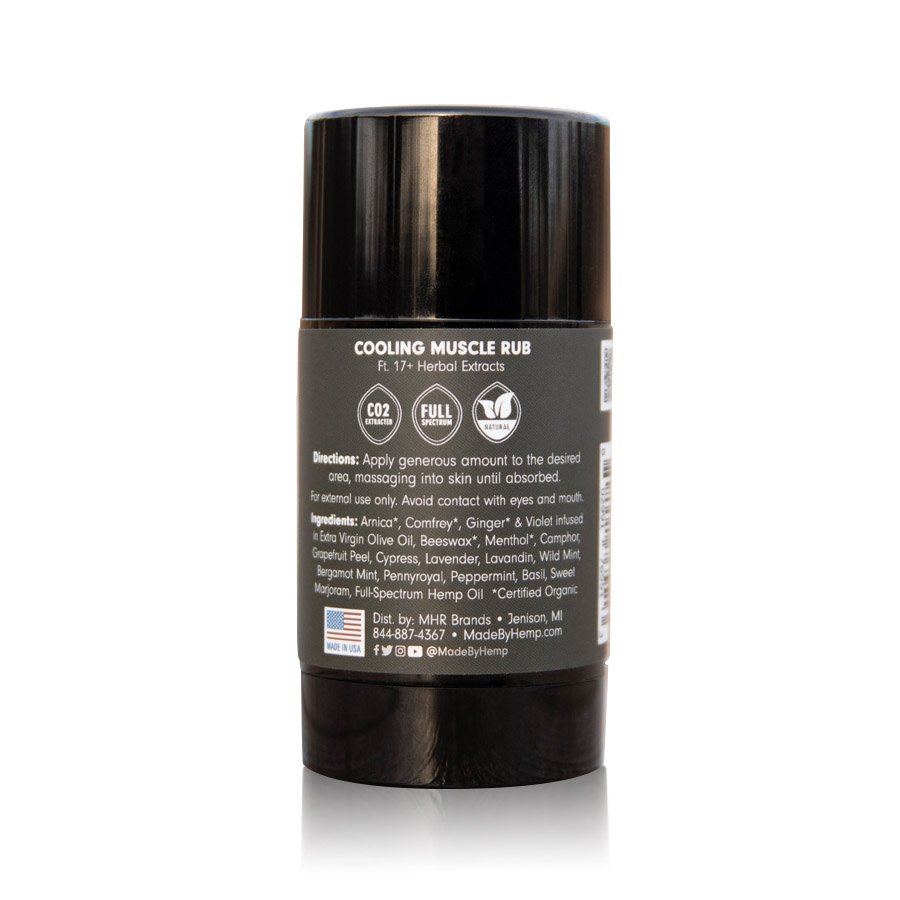 Ingredients: Beeswax*, Arnica*, Comfrey*, Ginger* & Violet* infused in Extra Virgin Olive Oil*, Menthol*, Camphor, Grapefruit Peel, Cypress, A-Pinene, Lavender, Lavandin, Wild Mint, Bergamot Mint, Pennyroyal, Peppermint, Basil, Marjoram, Full Spectrum Hemp Oil *Certified Organic