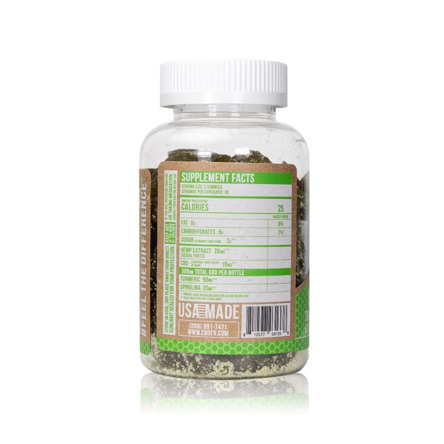 Organic Tapioca Syrup, Organic Cane Sugar, Water, Pectin, Natural Flavors, Citric Acid, Sodium Citrate, Organic Fruit and Vegetable Juice (for color) Turmeric, Spirulina, CBD Rich Hemp Oil