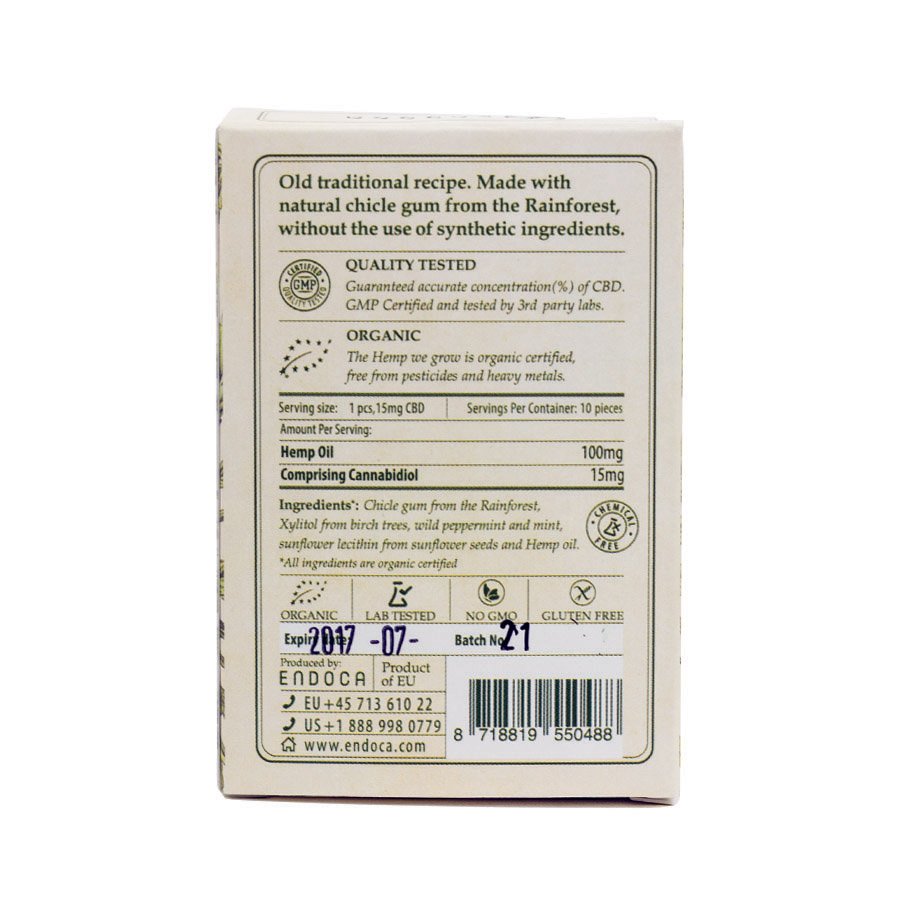 Ingredients: Chicle gum from the rainforest, Xylitol from birch trees, wild peppermint and mint, sunflower lecithin from sunflower seeds, hemp oil.