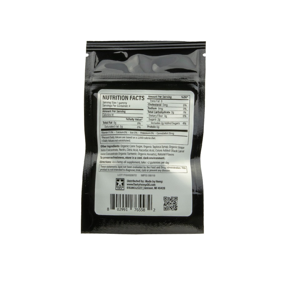 Active Ingredient: Gummy (Organic Cane Sugar, Organic Tapioca Syrup, Organic Grape Juice Concentrate, Pectin, Citric Acid, Ascorbic Acid, Colors Added [Black Carrot Juice Concentrate, Organic Turmeric,Organic Annatto], Natural Flavors), Hemp Oil